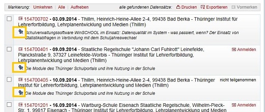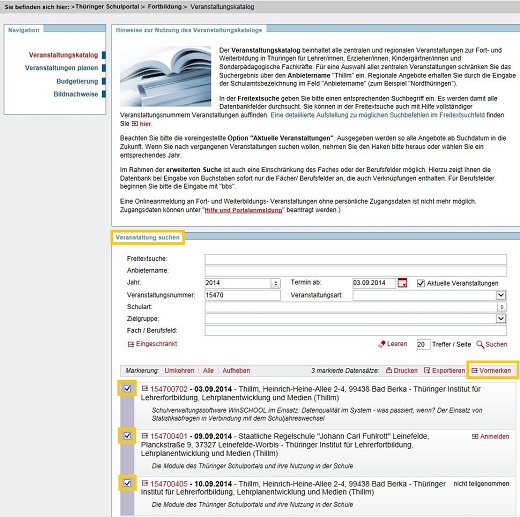 Sie können bei Ihrer Recherche im Veranstaltungskatalog konkrete Suchergebnisse markieren, wenn Sie mit Ihren persönlichen Zugangsdaten am Thüringer Schulportal angemeldet sind. Wählen Sie dazu in Ihrem Suchergebnis über die konkrete Markierung Veranstaltungen aus und betätigen Sie anschließend den Funktionslink VORMERKEN.