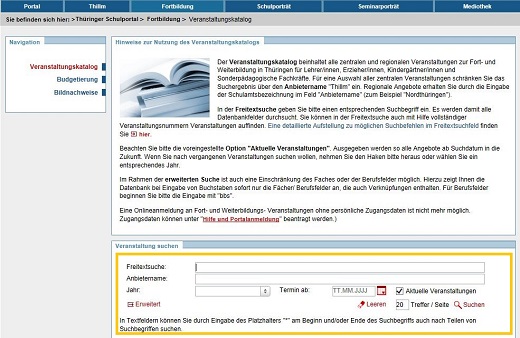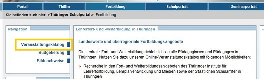 Um im Veranstaltungskatalog für Lehrerfort- und -weiterbildungen in Thüringen recherchieren zu können, wählen Sie bitte in der Quernavigation den Punkt FORTBILDUNG aus.