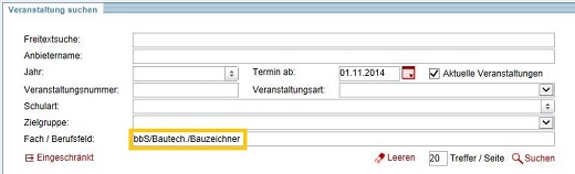 Im Rahmen der erweiterten Suche ist beispielsweise eine Einschränkung des Faches oder der Berufsfelder möglich. Hierzu zeigt Ihnen der Veranstaltungskatalog direkt bei buchstabenweiser Eingabe Ihres Faches sofort die Fächer/ Berufsfelder an, die auch Verknüpfungen zu Veranstaltungen enthalten. Für Berufsfelder beginnen Sie dabei bitte die Eingabe mit "bbs". Gefunden werden so nur Veranstaltungen, bei denen eine Verknüpfung mit dem ausgewählten Fach vorhanden ist.