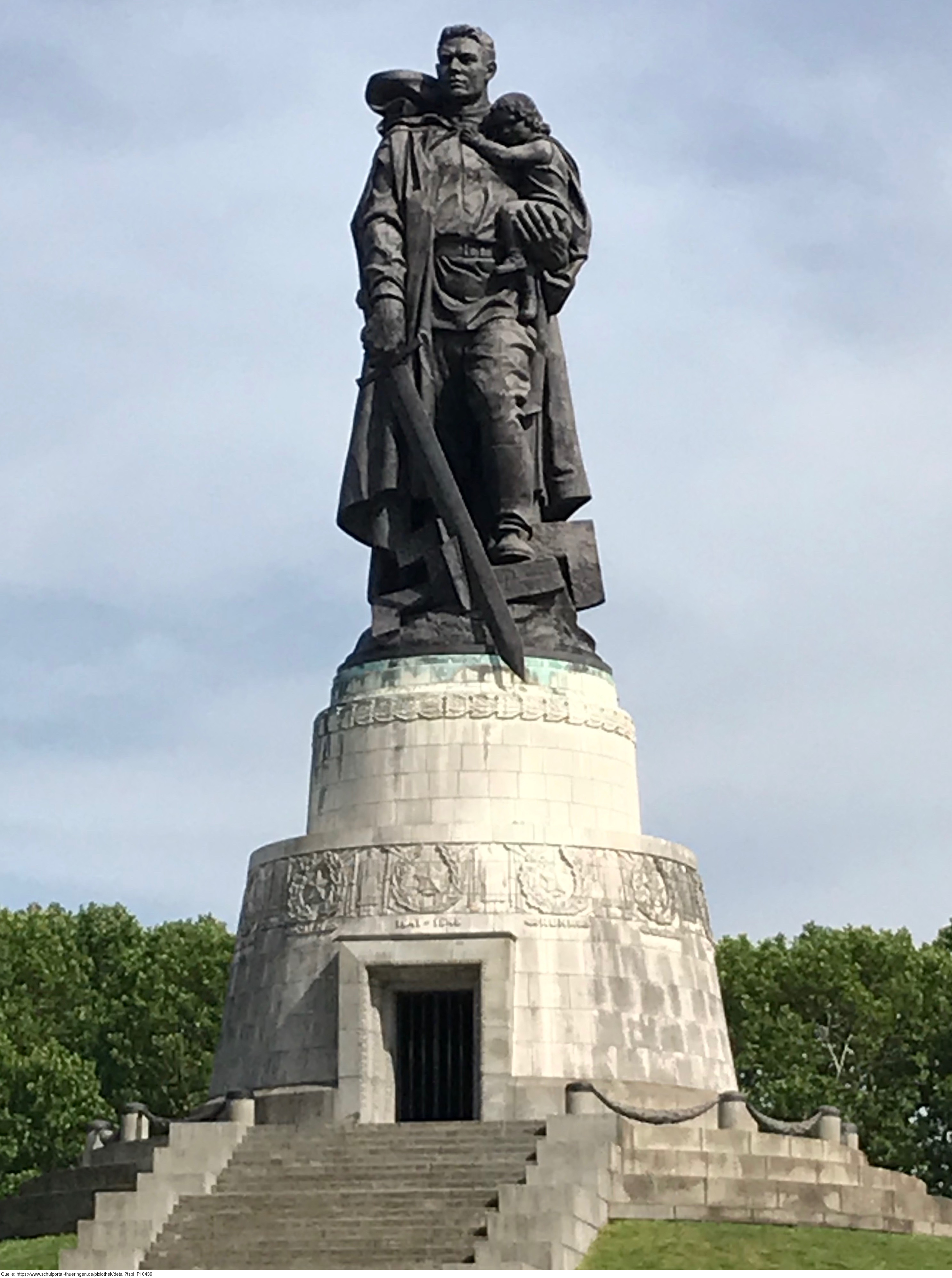 Das Sowjetische Ehrenmal ist eine Gedenkstätte und ein Soldatenfriedhof im Treptower Park in Berlin. Die im Mai 1949 fertiggestellte Anlage wurde auf Weisung der Sowjetischen Militäradministration in Deutschland errichtet, um die im Zweiten Weltkrieg gefallenen Soldaten der Roten Armee zu ehren. Es wurden ca. 7000 der in der Schlacht um Berlin gefallenen Soldaten hier bestattet. Ein breit angelegter, leicht ansteigender und von „trauernden“ Birken gesäumter Weg führt zum Hauptfeld der Gedenkstätte. Der Weg ist markiert durch zwei große, stilisierte Fahnen. An ihrer Stirnseite befindet sich jeweils die Skulptur eines knienden Soldaten in voller Montur und mit einer Maschinenpistole bewaffnet. Sechzehn weiße Sarkophage stehen entlang der äußeren Begrenzung. Sie sind auf den beiden Längsseiten mit Reliefs aus der Geschichte des Großen Vaterländischen Krieges der Sowjetvölker versehen und tragen auf der dem zentralen Feld zugewandten Schmalseite Zitate von Josef Stalin. Der zentrale Ort der Anlage wird durch eine auf einem Sockel stehende Skulptur „Der Befreier“ von Jewgeni Wutschetitsch gebildet. Die Figur stellt einen Soldaten dar, der in der rechten Hand ein Schwert und auf dem linken Arm schützend ein Kind trägt; ein Hakenkreuz zerbricht unter seinen Stiefeln. Die Skulptur ist 12 Meter hoch und 70 Tonnen schwer.