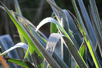 Das Bild zeigt Raueif auf den Laubblättern von Schilfrohr (Phragmites australis). Das Bild ist unter CC0 lizenziert und kann somit frei verwendet werden.