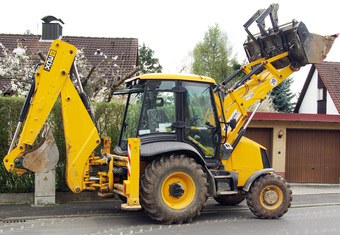 Das Bild zeigt einen Baggerlader, auch Heckbagger genannt, mit Ladeschaufel vorn und Tieflöffel hinten. Das Bild ist unter CC0 lizenziert und kann somit frei verwendet werden.
