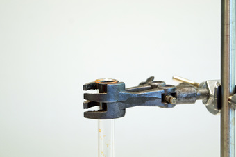 Das Foto gehört zur Serie "Experimente Chemie". Es zeigt ein Reagenzglas, das kurz unter dem Bördelrand in der Stativklammer eingespannt wurde. Das Bild ist unter CC0 lizenziert und kann somit frei verwendet werden.