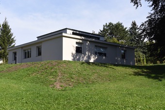 Das Foto gehört zur Serie "Bauhaus in Weimar". Das Musterhaus „Am Horn“ ist ein in Weimar errichtetes Versuchshaus des Staatlichen Bauhauses. Es war ein zentrales Element der ersten Bauhaus-Ausstellung vom 15. August bis 30. September 1923. Für das Bauhaus-Versuchshaus wurde der Entwurf von Georg Muche realisiert. Die praktische Umsetzung des Entwurfs Muches besorgten Walter March und Adolf Meyer vom Gropius’ Architekturbüro. Die Ausstattung basierte auf einem Gemeinschaftswerk aller Werkstätten des Bauhauses.