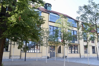 Das Foto gehört zur Serie "Bauhaus in Weimar". Im Zeitrahmen 1904 bis 1911 wurde nach Plänen Henry van de Veldes die Kunstgewerbeschule und später der Hochschulbau für Bildende Kunst in Weimar errichtet (heutiges Hauptgebäude der Bauhaus-Universität Weimar). Es ist eines der bedeutendsten Kunstschulbauten der Jahrhundertwende und war 1919 Gründungsort des von Walter Gropius ins Leben gerufene Staatlichen Bauhauses. Nach Art und Konzeption war es in dieser Zeit etwas völlig Neues, da das Bauhaus eine Zusammenführung von Kunst und Handwerk darstellte. Es gelten die Nutzungsbedingungen der Mediothek und Pixiothek.