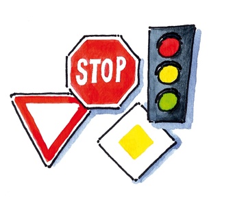 Das Bild gehört zur Serie "Schulfächer". Es zeigt ein gezeichnetes Symbolbild für Verkehrserziehung. Es gelten die Nutzungsbedingungen der Mediothek und Pixiothek.