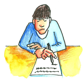 Das Bild gehört zur Serie "Unterricht". Es zeigt einen gezeichnete Jungen beim Schreiben. Es gelten die Nutzungsbedingungen der Mediothek und Pixiothek.