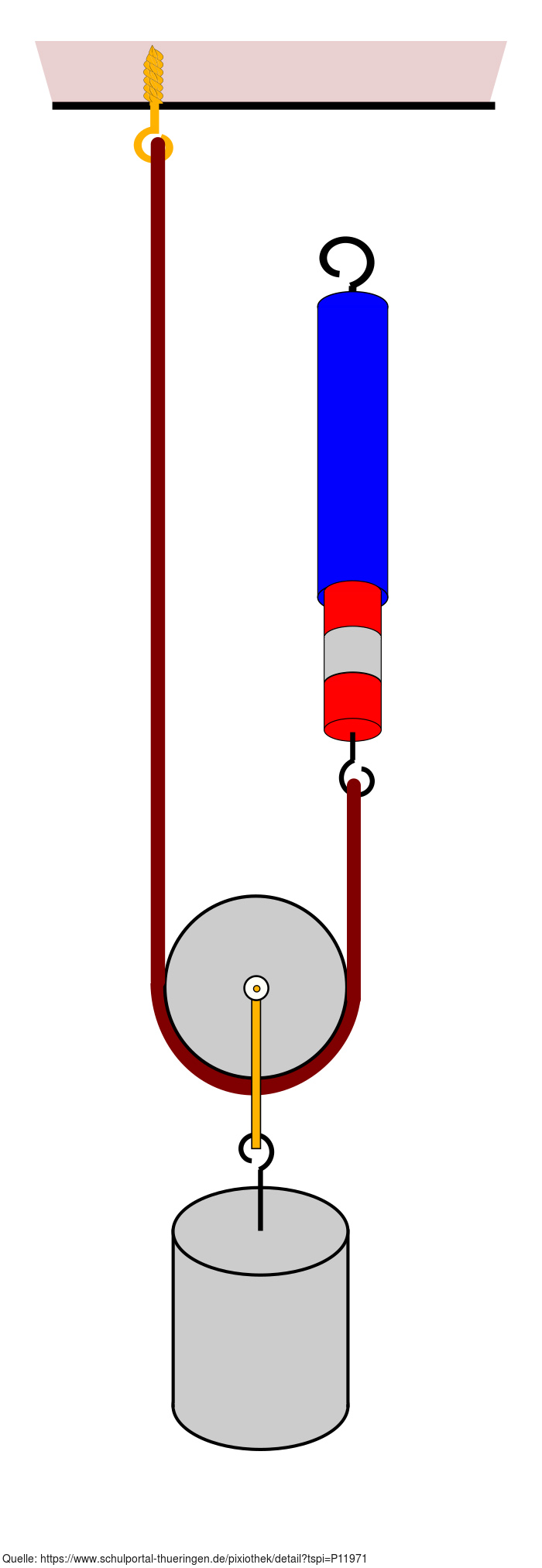 Das Bild gehört zur Serie "Physik, Mechanik". Es zeigt eine lose Rolle mit angehängtem Massenstück und Federkraftmesser. Das Bild ist unter CC0 lizenziert und kann somit frei verwendet werden.
