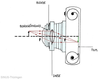 Die Zeichnung zeigt den Aufbau eines Fotoapparates mit Kleinbildfilm, eine Analogkamera. Zu sehen ist der Strahlengang der drei Hauptstrahlen von einem Gegenstand durch die Linse bis zum Bild. Es gelten die Nutzungsbedingungen der Mediothek und Pixiothek.