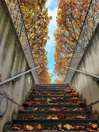 Durch bunte Blätter die Treppe hinauf in einen Tag im Herbst. Es gelten die Nutzungsbedingungen der Mediothek und Pixiothek.