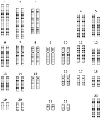 Karyogramm einer Frau mit Cri-Du-Chat-Syndrom / Katzenschrei-Syndrom (Deletion an Chromosom arm 5p). Es gelten die Nutzungsbedingungen der Mediothek und Pixiothek. Auf http://unterricht.petzinger.net/biochdropbox.html auch als svg und in CC-BY verfügbar.