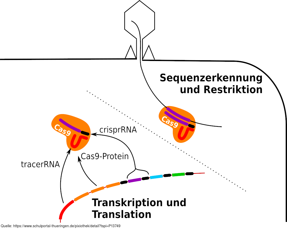 Expression von CRISPR/Cas zur Abwehr einer erneuten Phagen-Infektion. Es gelten die Nutzungsbedingungen der Mediothek und Pixiothek. Auf http://unterricht.petzinger.net/biochdropbox.html auch als svg und in CC-BY verfügbar.