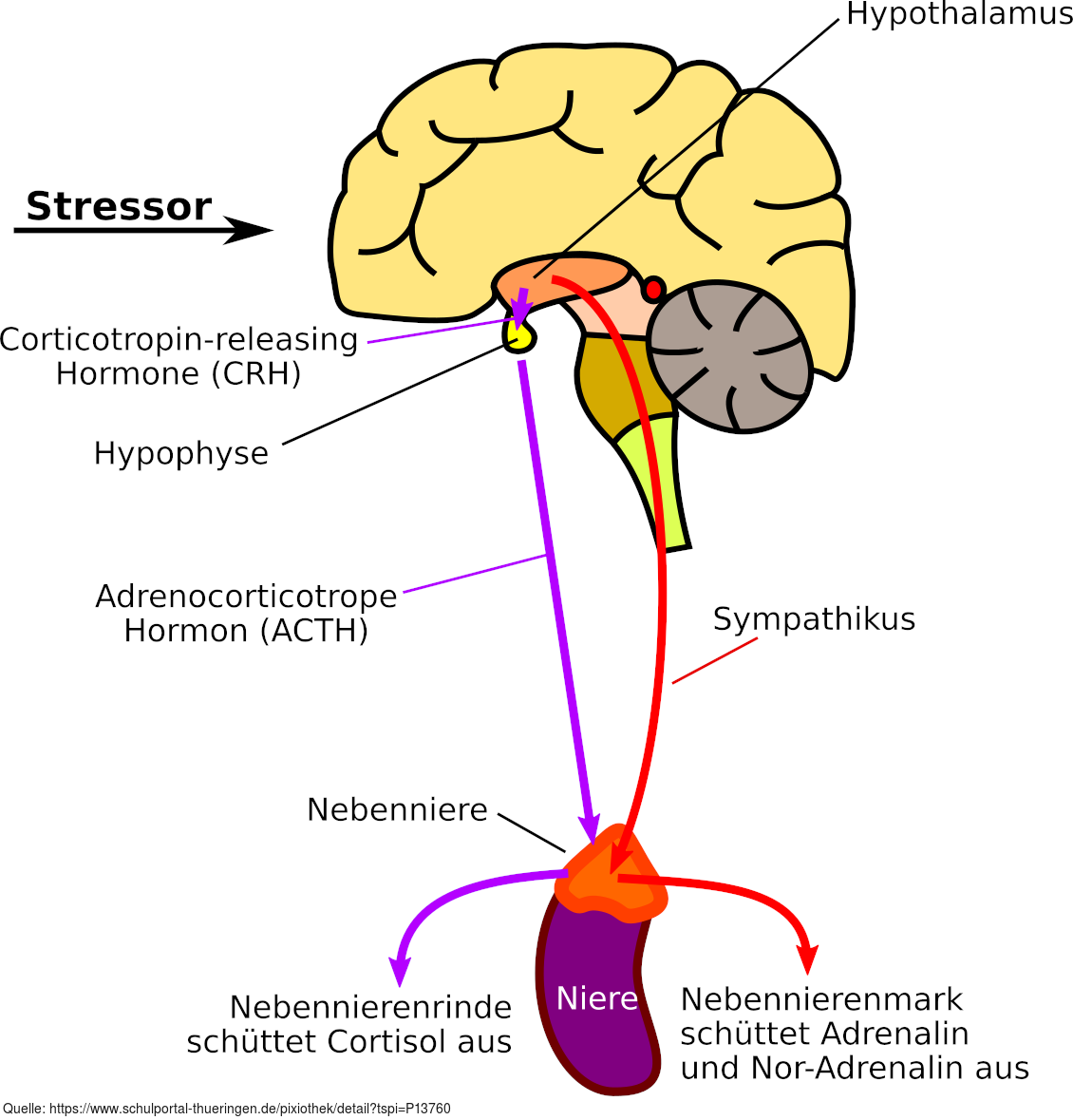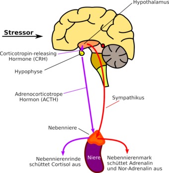 Aberlauf der nervösen (kurzzeitigen) bzw. hormonellen (langzeitigen) Stressreaktion. Es gelten die Nutzungsbedingungen der Mediothek und Pixiothek. Auf http://unterricht.petzinger.net/biochdropbox.html auch als svg und in CC-BY verfügbar.