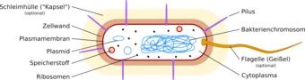 Aufbau / Struktur eines Bakteriums. Es gelten die Nutzungsbedingungen der Mediothek und Pixiothek. Auf http://unterricht.petzinger.net/biochdropbox.html auch als svg und in CC-BY verfügbar.