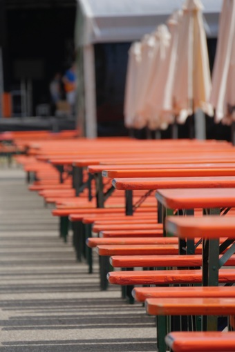Das Bild zeigt zusammengerückte Bierbänke in einem meschenleeren Biergarten oder auf einem Veranstaltungsgelände. Somit könnte es auch als Symbolbild für einen Lockdown verwendet werden. Das Bild ist unter CC0 lizenziert und kann somit frei verwendet werden.