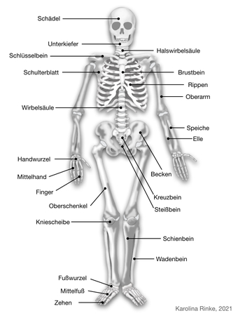 Das Bild zeigt den Aufbau vom menschlichen Skelett. Bild-Variante: Skelett; s/w; beschriftet. Es gelten die Nutzungsbedingungen der Mediothek und Pixiothek.