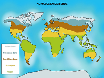 Das Bild verdeutlicht die Lage der Klimazonen der Erde. Bild-Variante: farbig; beschriftet. Es gelten die Nutzungsbedingungen der Mediothek und Pixiothek.