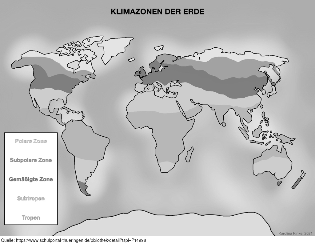 Das Bild verdeutlicht die Lage der Klimazonen der Erde. Bild-Variante: s/w; beschriftet. Es gelten die Nutzungsbedingungen der Mediothek und Pixiothek.