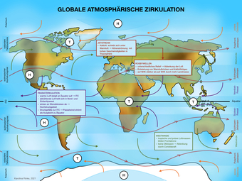 Das Bild gehört zur Serie „Zirkulationssysteme der Erde“. Es verdeutlicht die globale atmosphärische Zirkulation der Erde. Bild-Variante: farbig; beschriftet. Es gelten die Nutzungsbedingungen der Mediothek und Pixiothek.