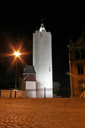 Motiv eines Stadtrundganges durch Pößneck (Ostthüringen) bei Nacht. Abgebildet ist der Weiße Turm, eines der Wahrzeichen der Stadt. Es gelten die Nutzungsbedingungen der Mediothek und Pixiothek.
