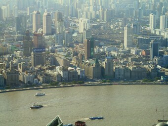 Das Foto gehört zu einer Serie mit 3 Motiven der Stadt Shanghai, aufgenommen im Oktober 2005. Die Fotos liegen jeweils im Original vor (sonniges Wetter, aber dunstig) sowie in einer bearbeiteten Version (Helligkeit herab-, Kontrast heraufgesetzt, Farbtemperatur und -ton verbessert; subjektiver Eindruck). Die Bilder dieser Serie können als Anregung bzw. als Einstieg für das Thema Bildbearbeitung dienen.