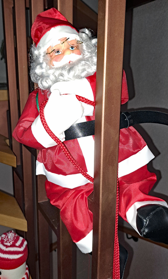 Das Foto gehört zur Serie "Weihnacht". Es zeigt einen Weihnachtsmann beim Abseilen in einem Treppenhaus.. Es gelten die Nutzungsbedingungen der Mediothek und Pixiothek.