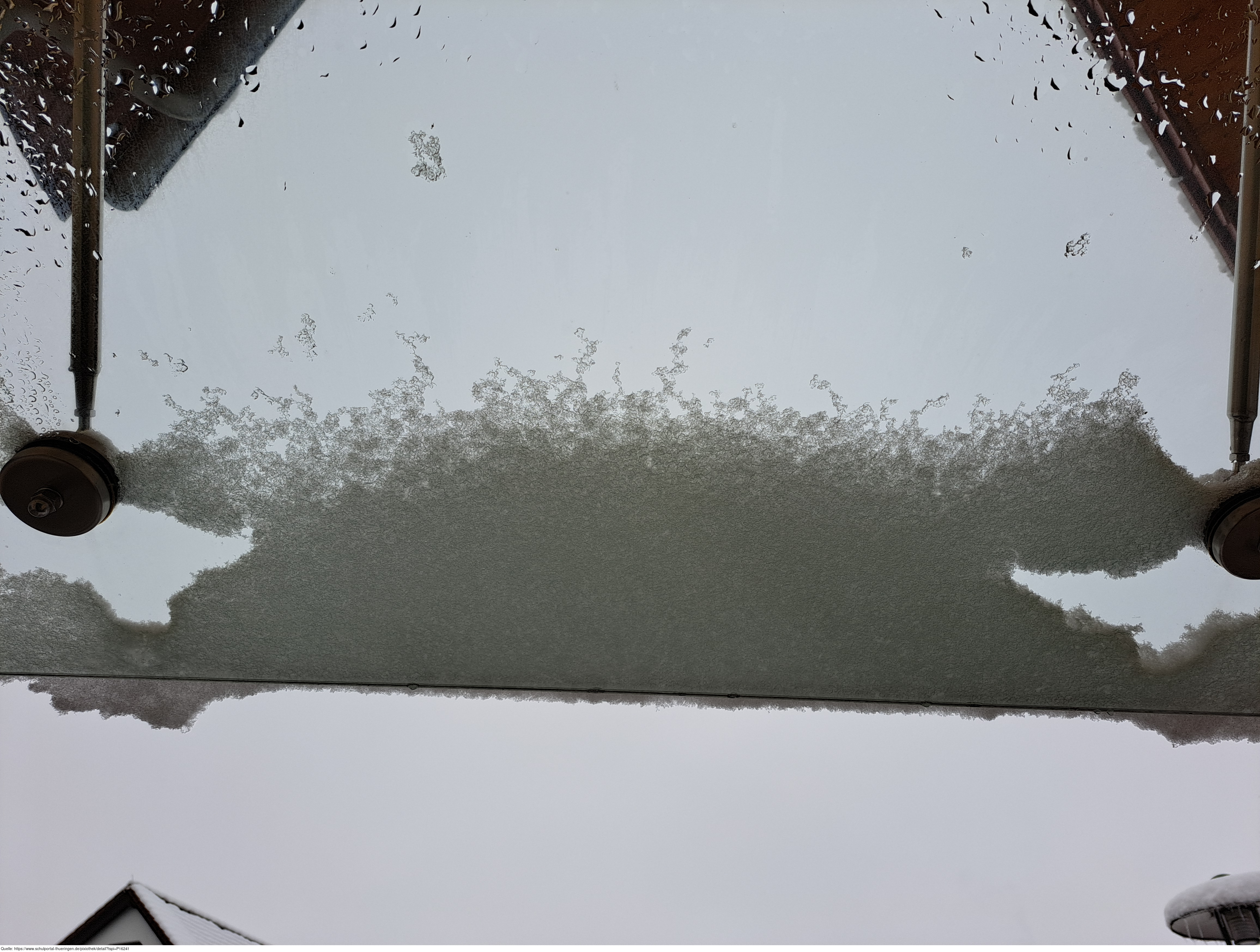 Das Foto zeigt Schnee auf einem schrägen Vordach aus Glas, der langsam nach vorn abrutscht. Das Motiv kann auch als Modellansicht für die Bewegung von Gletschern genutzt werden. Das Bild ist unter CC0 lizenziert und kann somit frei verwendet werden.