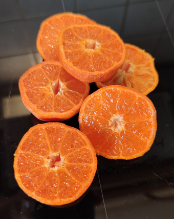 Das Bild gehört zur Serie "Obst". Zu sehen sind aufgeschnittene Mandarinen. Es gelten die Nutzungsbedingungen der Mediothek und Pixiothek.