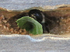 Imker am geöffnete Bienenvolk mit gezogener Wabe