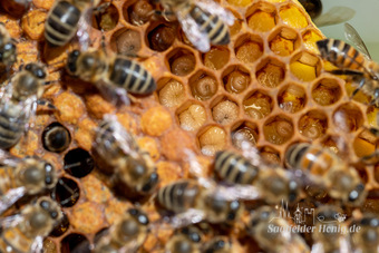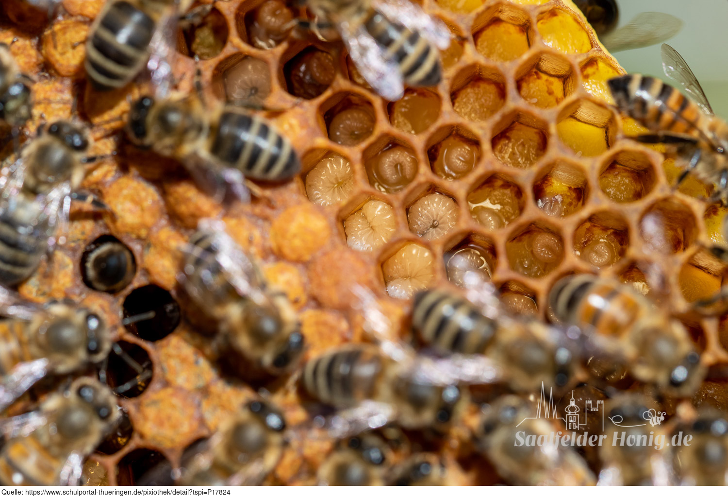 Das Bild gehört zur Serie "Saalfelder Honig", aufgenommen vom Imker Bernd Rümpler, Inhaber von saalfelder-honig.de. Zu sehen sind Stockbienen bei der Brutpflege. Rechts oben: frisch gelegte Eier (Stifte). Darunter: kleine und größere Maden im Futtersaft. Links untern: verdeckelte Maden.
