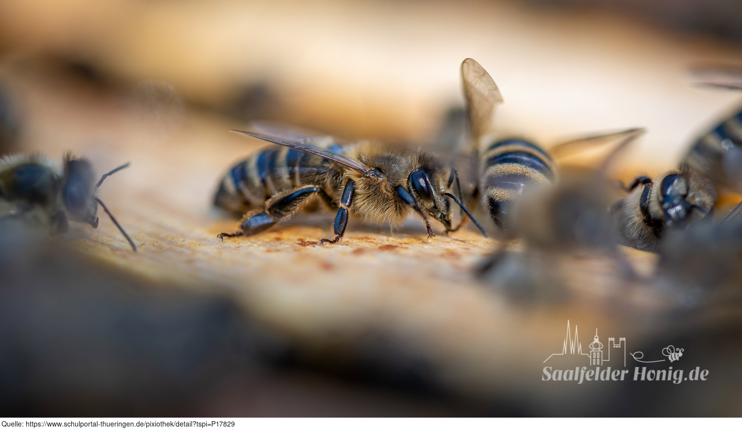 Das Bild gehört zur Serie "Saalfelder Honig", aufgenommen vom Imker Bernd Rümpler, Inhaber von saalfelder-honig.de. Zu sehen ist Biene (Arbeiterin) am Flugloch. Es gelten die Nutzungsbedingungen der Mediothek und Pixiothek.