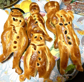 Das Foto zeigt einige fertig gebackene Weckmänner. Als Weckmann wird ein Gebäck in Form eines stilisierten Mannes aus Hefeteig bezeichnet, welches oftmals mit Rosinen verziert ist. Es gelten die Nutzungsbedingungen der Mediothek und Pixiothek