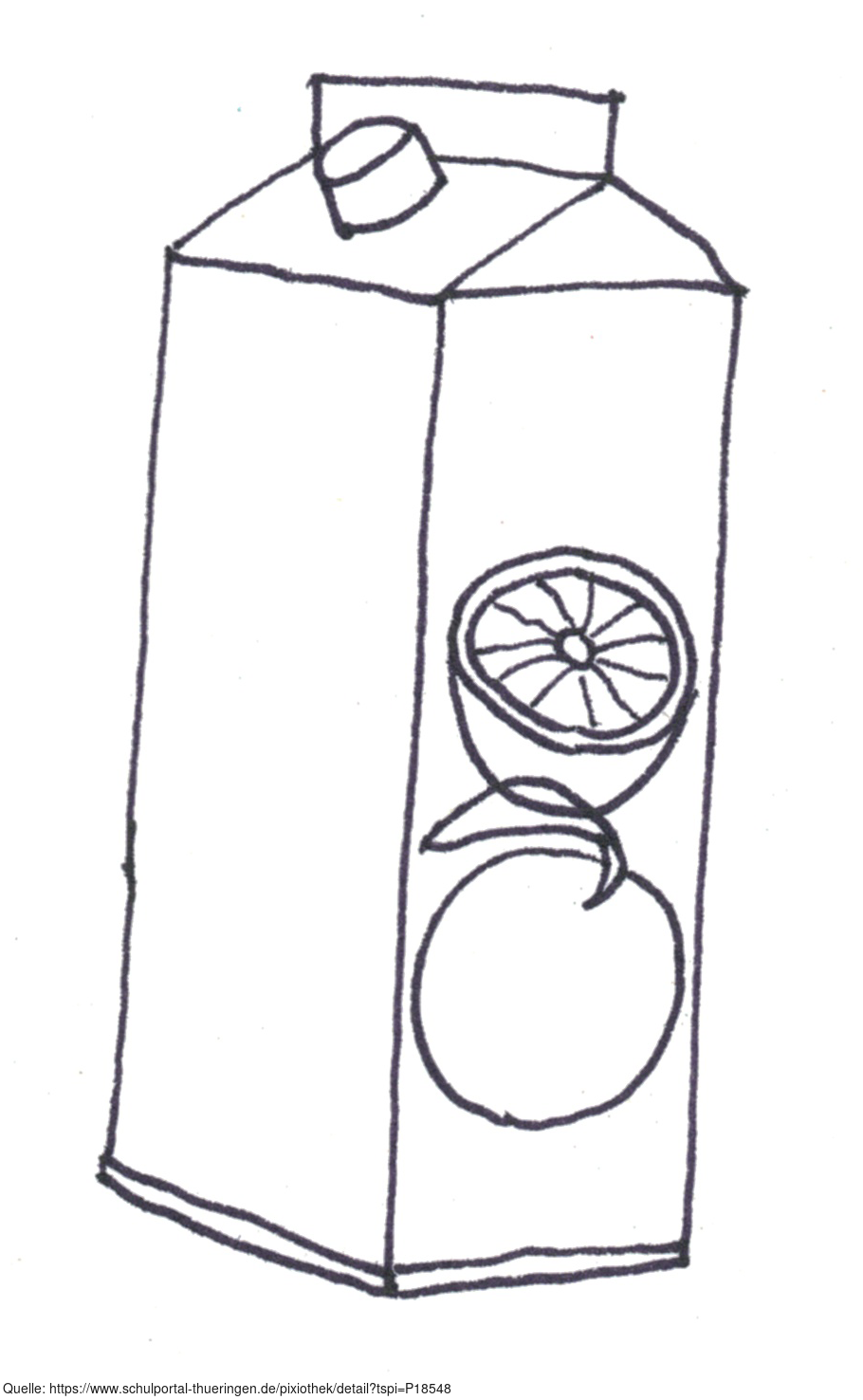 Das Bild zeigt eine gezeichnete Packung Orangensaft (s/w). Es gehört zur Serie "Ernährungspyramide zum Basteln und Gestalten" und findet u.a. im gleichnamigen Lernobjekt unter https://www.schulportal-thueringen.de/web/guest/media/detail?tspi=18517 Verwendung. Es gelten die Nutzungsbedingungen der Mediothek und Pixiothek.