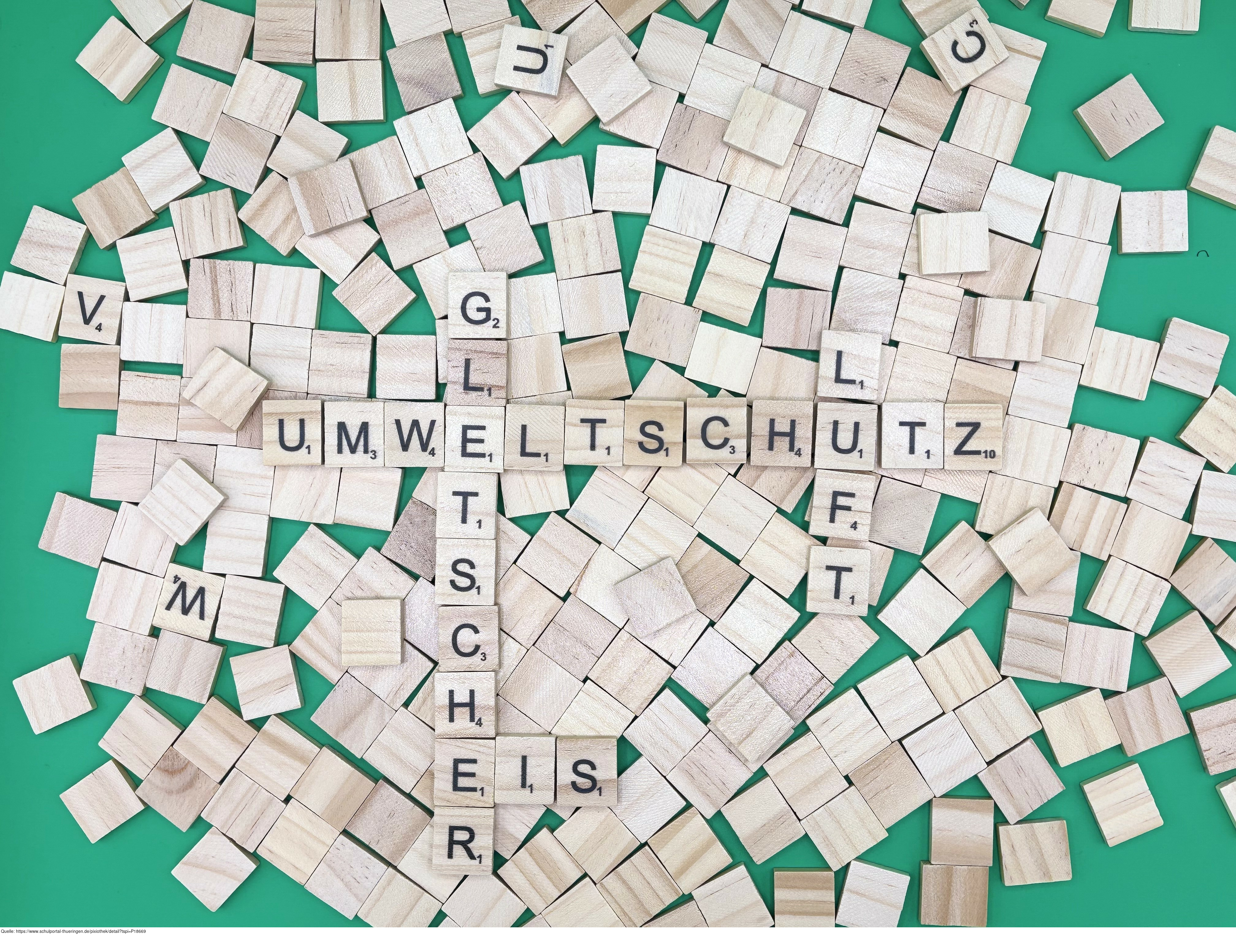 Aus Buchstaben wurden die Begriffe "Umweltschutz", "Gletscher", "Eis" und "Luft" gelegt. Es gelten die Nutzungsbedingungen der Mediothek und Pixiothek.
