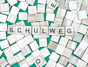 Aus Buchstaben wurde der Begriff „Schulweg" gelegt. Es gelten die Nutzungsbedingungen der Mediothek und Pixiothek.