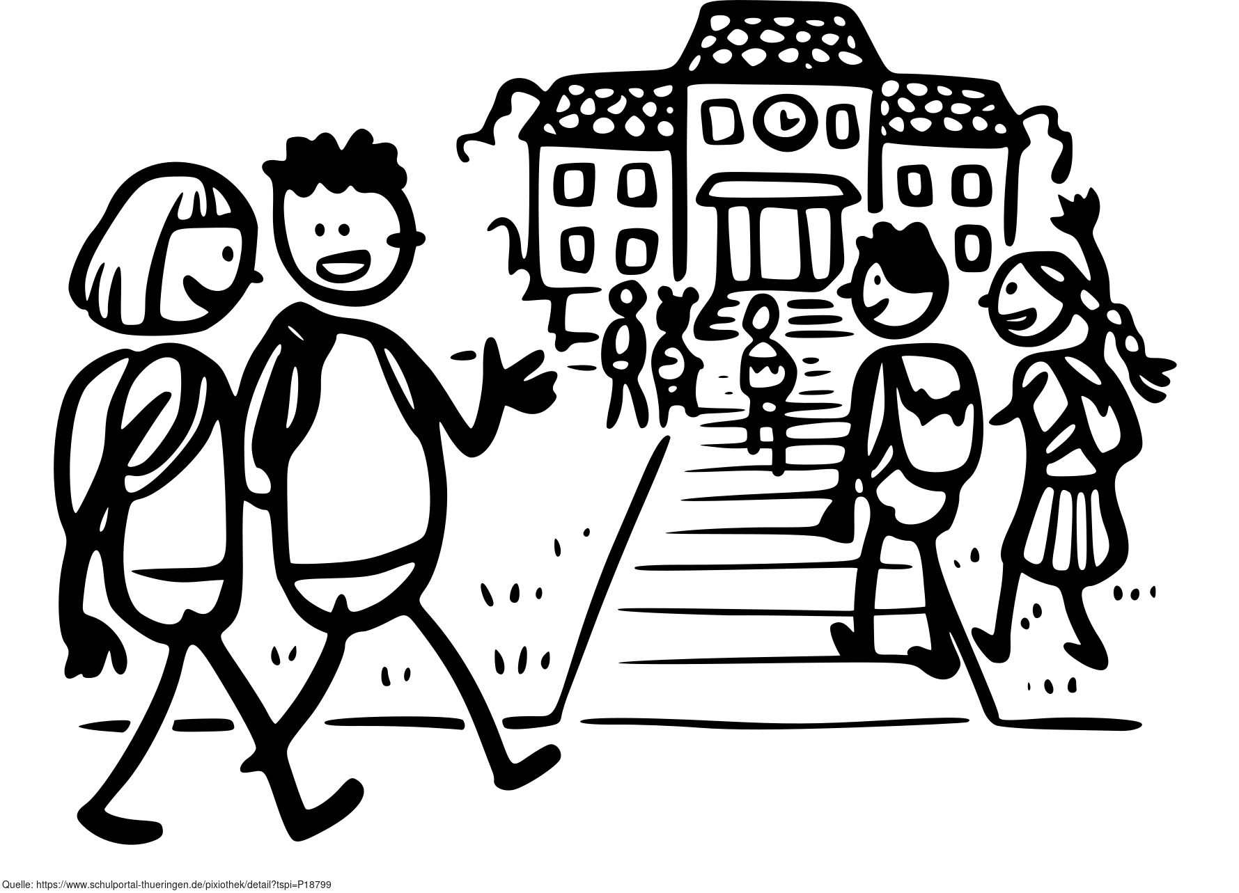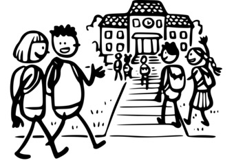 Die Zeichnung zeigt ein Schülerinnen und Schüler auf dem Weg zur Schule. Das Bild ist unter CC0 lizenziert und kann somit frei verwendet werden. Es ist neben weiteren Bildern auch hier zu finden: https://cocomaterial.com