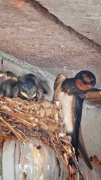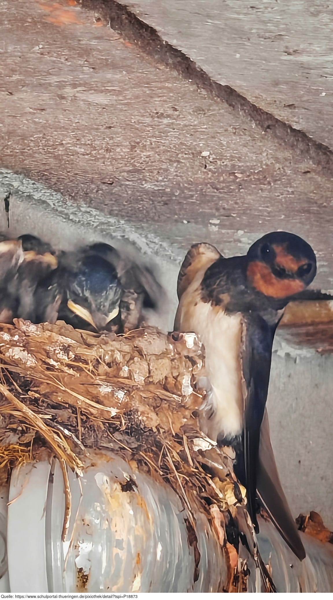 Das Foto gehört zur Serie "Schwalbenfreundliches Haus". Es zeigt junge Rauchschwalben nach der Fütterung im Nest. Das Nest befindet sich in einer Scheune, die für Vögel und Fledermäuse einige offene Durchflugsmöglichkeiten bereithält. Es gelten die Nutzungsbedingungen der Mediothek und Pixiothek.