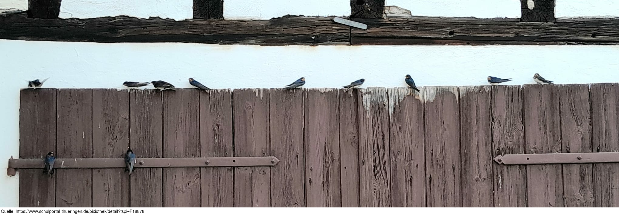 Das Foto gehört zur Serie "Schwalbenfreundliches Haus". Es zeigt junge Rauchschwalben und ihre Elterntiere. Das Nest befindet sich in einer Scheune, die für Vögel und Fledermäuse einige offene Durchflugsmöglichkeiten bereithält. Es gelten die Nutzungsbedingungen der Mediothek und Pixiothek.