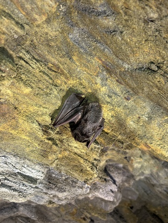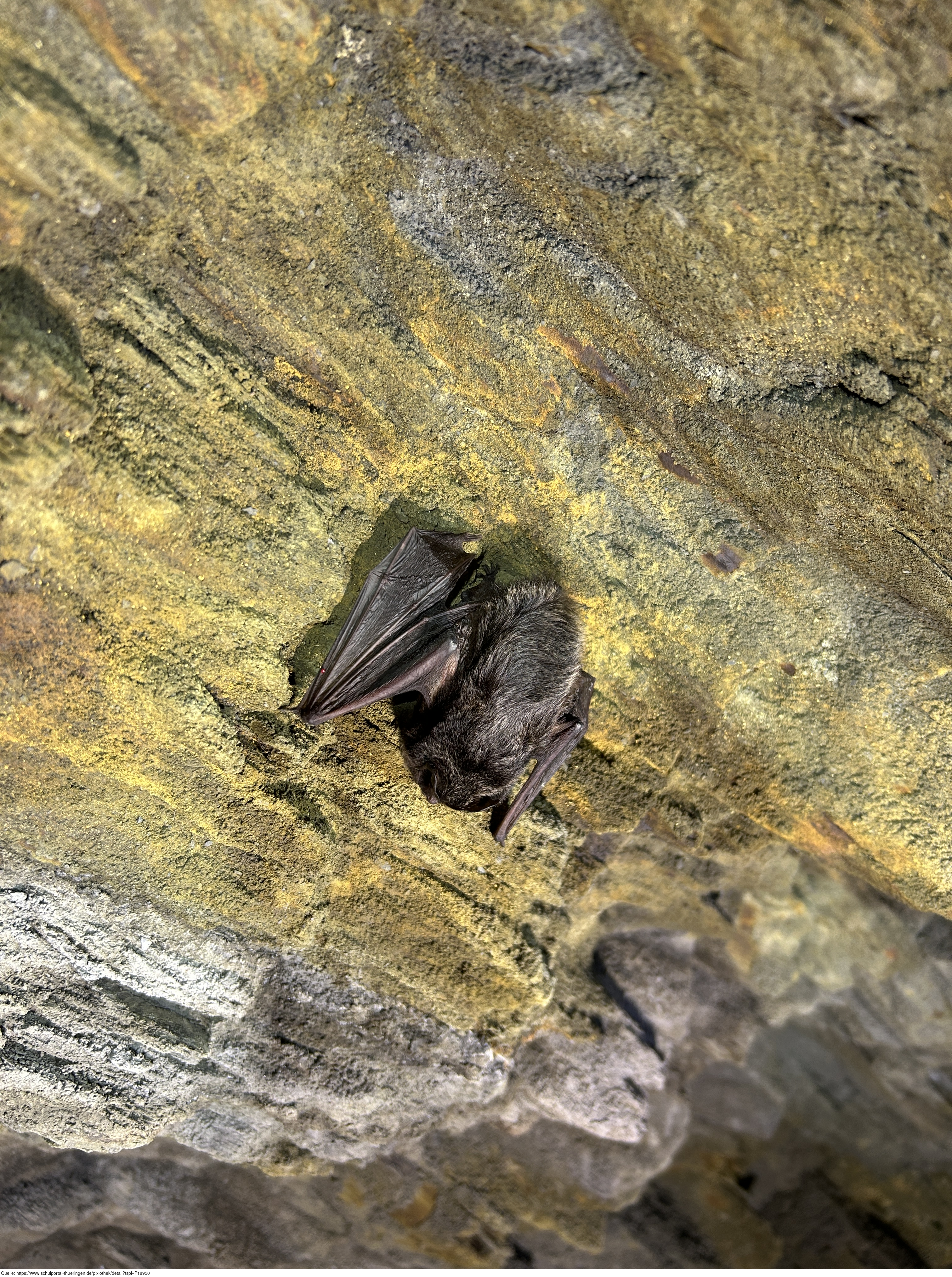 Das Bild zeigt eine Kleine Hufeisennase (Fledermausart) in einem Schieferstollen. Es gelten die Nutzungsbedingungen der Mediothek und Pixiothek.