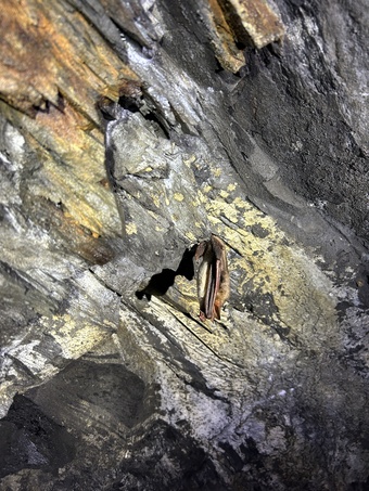 Das Bild zeigt ein Großes Mausohr (Fledermausart) in einem Schieferstollen. Es gelten die Nutzungsbedingungen der Mediothek und Pixiothek.