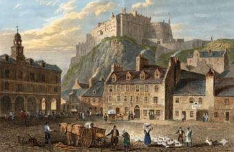 Edinburgh Castle vom Grassmarket aus gesehen (choloriert)