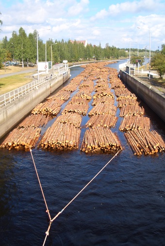 Abgebildet ist der Holztransport zu Wasser in Joensuu