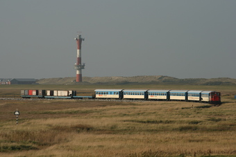 Abgebildet ist die Inselbahn mit dem neuen Leuchtturm.