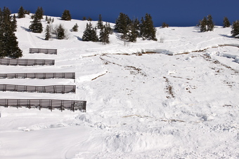 Das Foto gehört zur Serie "Lawinenschutz" mit Fotos aus den Gegenden Walmendinger Horn (Österreich, Kleinwalsertal) und Fellhorn (Deutschland). Es zeigt links Schneebrücken und rechts eine Schneelawine (Schneebrett) an einem Berghang. Es gelten die Nutzungsbedingungen der Mediothek und Pixiothek.
