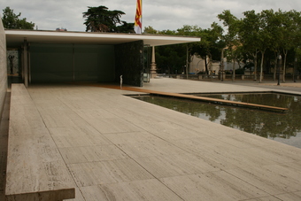 Das Foto gehört zur Serie "Deutscher Weltausstellungspavillon Barcelona 1929". Der deutsche Architekt Ludwig Mies van der Rohe entwarf diesen Ausstellungspavillon. Er gilt heute als Architekturikone des 20. Jahrhunderts. Das Bild zeigt die Vorderansicht vom Pavillon. Es gelten die Nutzungsbedingungen der Mediothek und Pixiothek.