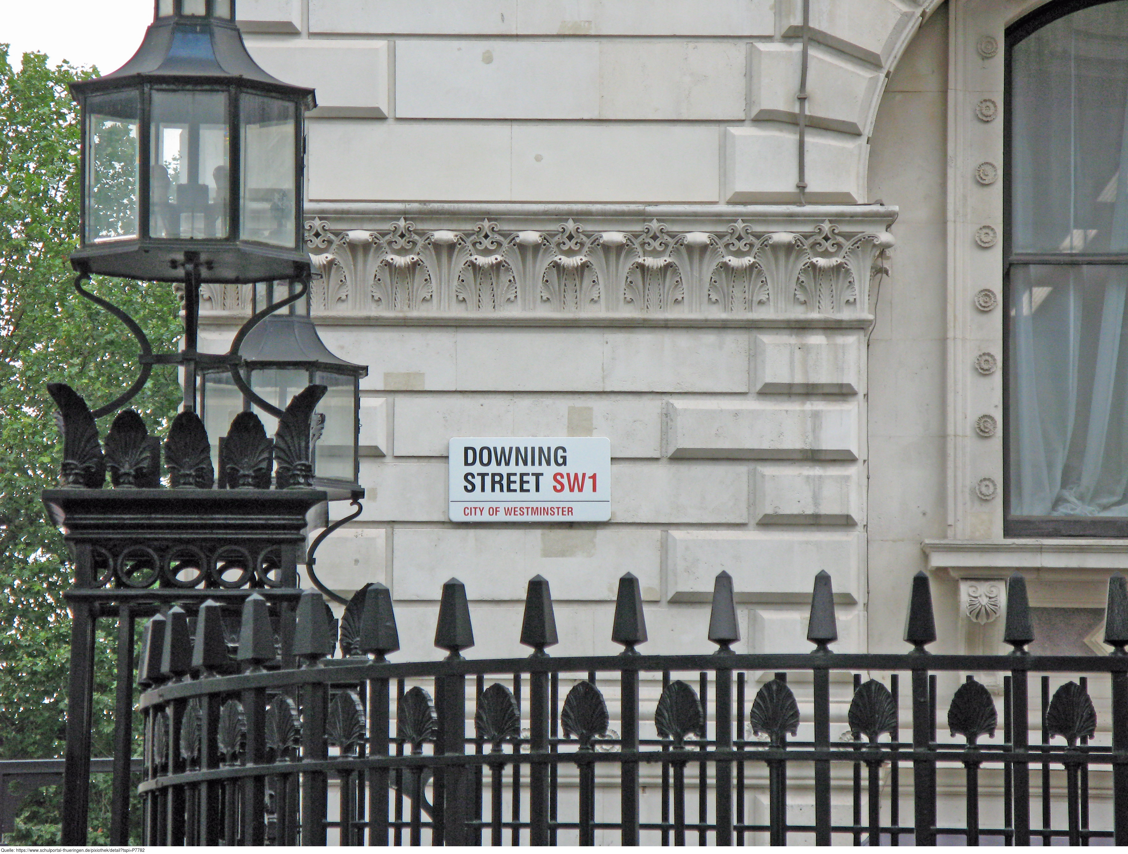 Das Foto gehört zur Serie London 2016. Es zeigt das Straßennamensschild der Downing Street auf der Seite von Whitehall, einer Straße im Regierungsviertel Westminster. Es gelten die Nutzungsbedingungen der Mediothek und Pixiothek.