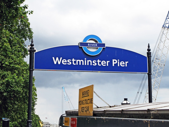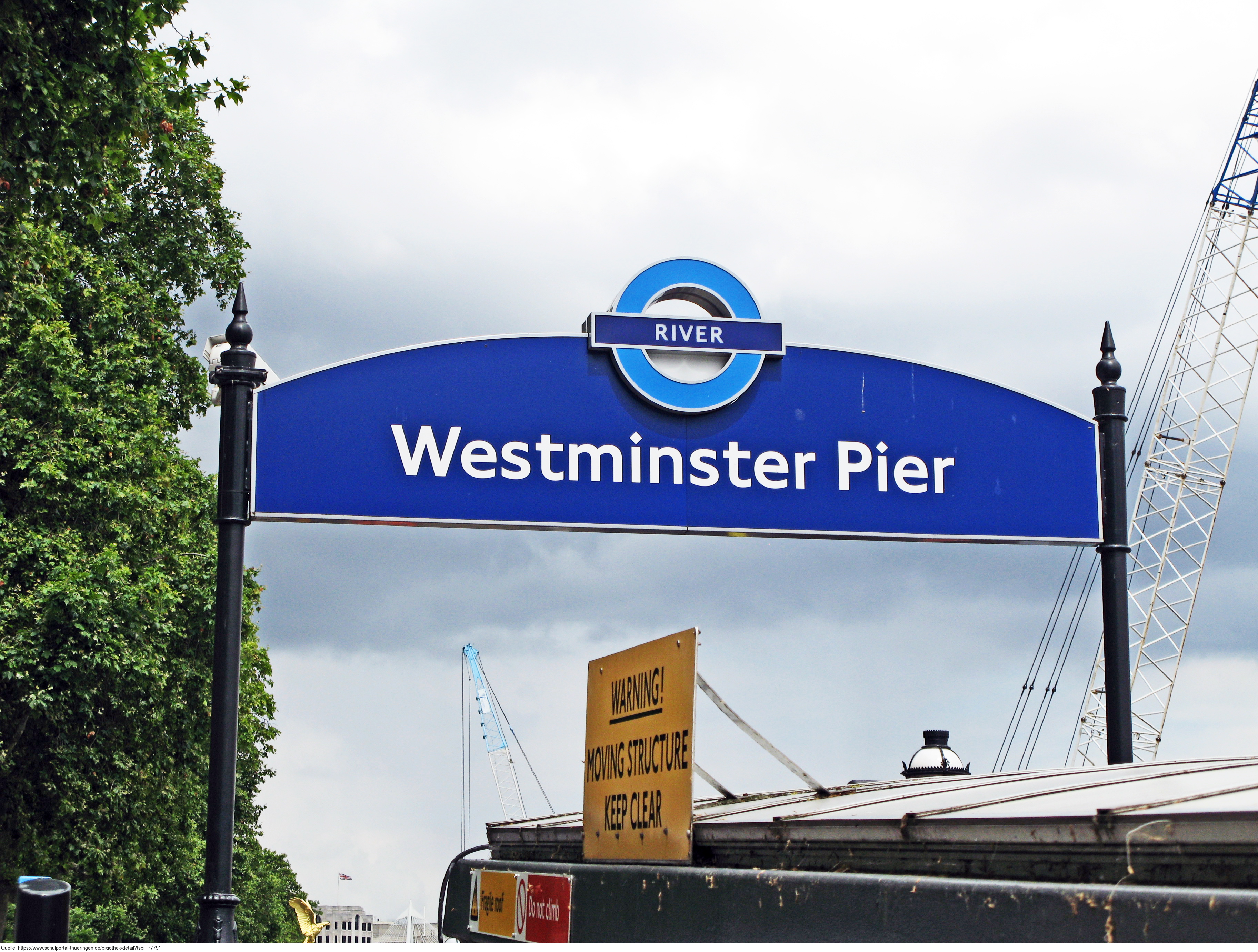 Das Foto gehört zur Serie London 2016. Es zeigt das Schild über der Treppe, die hinunter zum Westminster Pier führt. Dieser Eingang liegt gegenüber dem Elizabeth Tower neben der Westminster Bridge. Es gelten die Nutzungsbedingungen der Mediothek und Pixiothek.