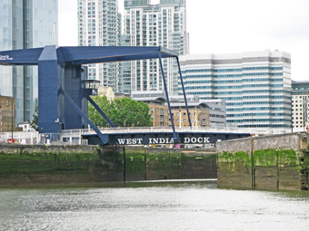 Das Foto gehört zur Serie London 2016. Es zeigt die Blue Bridge, über die die Preston's Road (A1202) führt. Dahinter befindet sich die Schleuse zum South Dock und die Hochhäuser der Canary Wharf in den Docklands. Es gelten die Nutzungsbedingungen der Mediothek und Pixiothek.