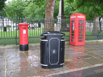 London: Pillar box, litter bin, telephone box
