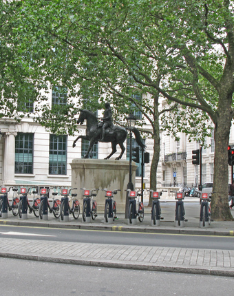 Das Foto gehört zur Serie London 2016. Es zeigt die King George III Statue (1 Pall Mall E, London SW1Y 5AU) und davor Leih-Fahrräder. Es gelten die Nutzungsbedingungen der Mediothek und Pixiothek.
